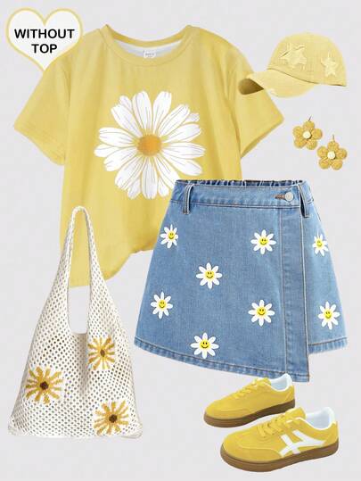 Girlism Tween Girls' Spring Summer Casual Vacation Style Boho Daisy Flowers Print Asymmetrical Hem Blue Denim Jeans Skirt,For Girls Spring/Summer Dailywear Outfits,Girls Streetwear Outfit,For Girls Vacation Boho Outfits,Girls Valentines Day Outfit,Beach Party Outfits For Girls,For Girls Birthday Party Dresses And Summer Holiday Outfits,Casual Skirt For Girls,Girls Y2k Flower Jeans Skirt,Graphic Skirt Girls,Summer Skirt - Light Wash - View 1