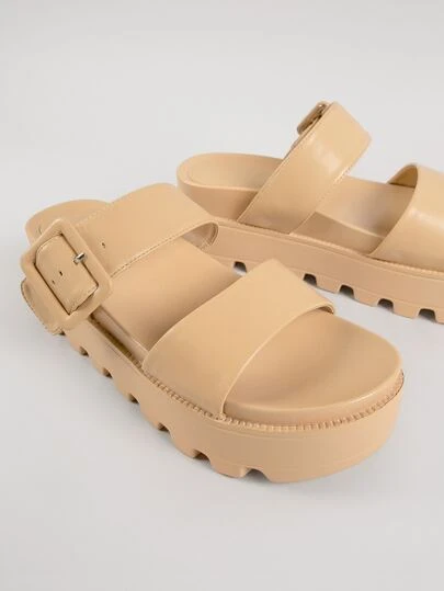 Vegan Leather Buckled Lug Platform Slides - Apricot - View 1