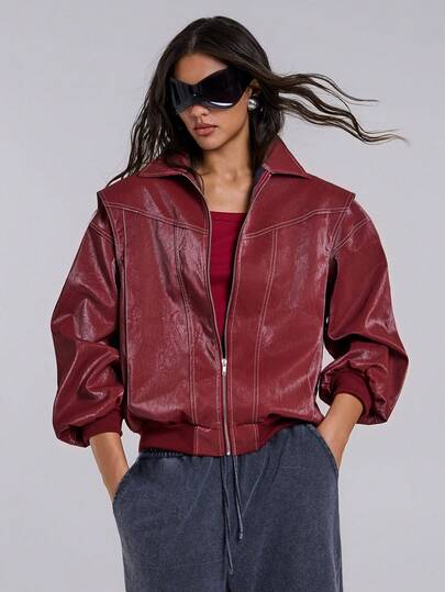 TypaGal Winter Fall Modern Chic New Year Party Retro Elegant Sexy Street Minimalist Red Loose Fit Turn-Down Collar Solid Color Zipper-Up Casual Long Sleeve PU Leather Pocket Jacket In Fall/Winter - Red - View 1