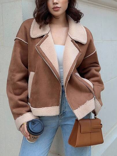 DAZY Women's Faux Shearling Patchwork Oversized Casual Fuzzy Jacket Winter Thermal Lined Women Coats - Brown - View 1