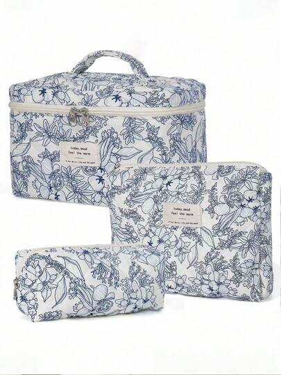 3 pièces - 1 pièce grand sac de maquillage imprimé avec poignée, sac organisateur d'outils de maquillage portable, sac de maquillage épais imprimé pour femmes, sac de rangement de voyage, sac de cosmétiques, sac organisateur de voyage pour cosmétiques, sac de toilette de voyage, accessoire essentiel pour la maison, sac de toilette et de maquillage de voyage, décoration de salle de maquillage, sac de maquillage, accessoire de voyage - Bleu marine - Voir 3