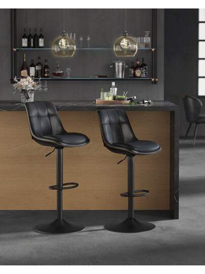 Tabourets de Bar, Lot de 2, Chaise de Cuisine, Siège Pivotant à Hauteur Réglable, flanelle/ PU, avec Dossier et Repose-Pieds, Salle à Manger, Comptoir, Acier,  Noir d'encre - Noir d'encre - Voir 1