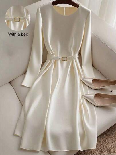 Franclia Robe blanche élégante pour femme, col rond avec ceinture, style décontracté chic pour les études, les vacances et les voyages. Tenue blanche pour l'automne et l'été. - Blanc - Voir 1