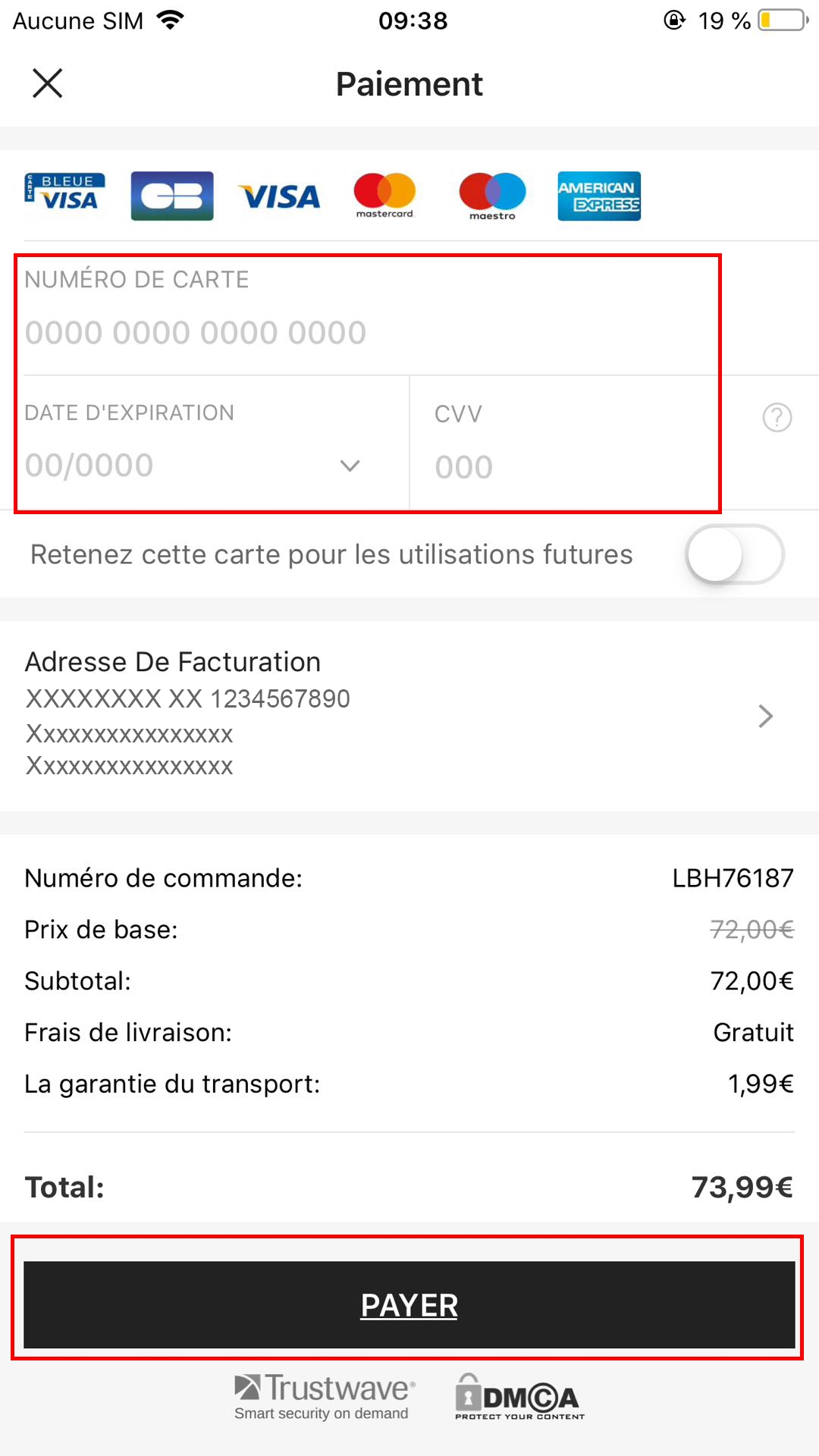 Remplissez les informations de paiement, puis cliquez sur le bouton PAYER pour compléter l'achat.
