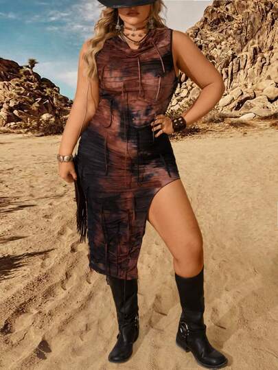 Flirla Robe moulante grande taille à col drapé et fendue haute en tie-dye - Multicolore - Voir 1