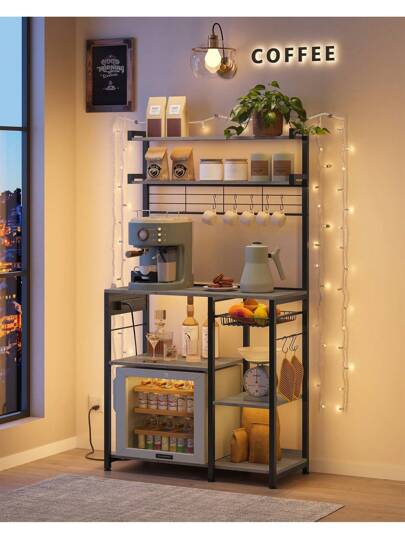 VASAGLE Étagère Cuisine avec Multiprise, Support pour Micro-Ondes, Bar à Café, 4 Prises CA, Étagères Réglables, 8 Crochets en S, Panier, Porte-épices, Grège, noir - Grège, noir - Voir 1