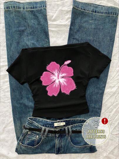 Attitoon t-shirt ajusté à manches courtes, à une épaule, avec taille froncée, motif floral, convient pour l'été - Noir - Voir 1