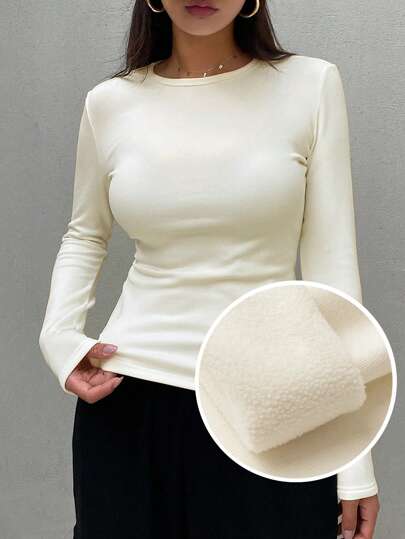 DAZY T-shirt décontracté et simple pour femmes, hauts à manches longues pour femmes pour un port quotidien, doublure thermique pour l'automne et l'hiver - Beige - Voir 1