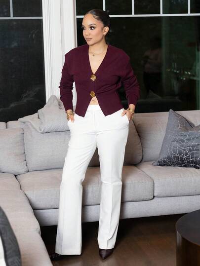 Melissa Matos Cardigan en tricot asymétrique à boutons de mode décontractée minimaliste pour femmes, pull sophistiqué - Rouge foncé - Voir 2
