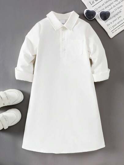 Baby Girl Autumn/Winter New Fashionable Elegant Outdoor Casual Breathable Loose White Solid Color Long Sleeve Collar Pocket Shirt Dress - White - View 1