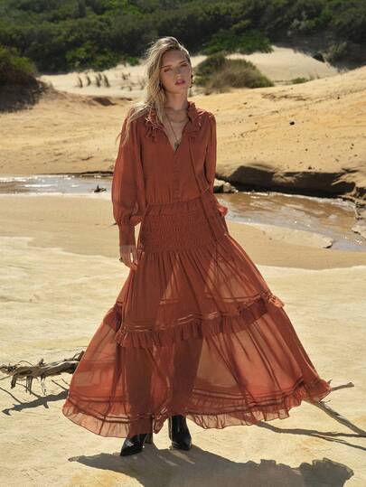 MOTF STUDIO WOMEN'S CHIFFON RUFFLED BUTTON DETAIL DRESS WITH LAYERED FLOWY HEM, SPRING/SUMMER - Brown - View 5