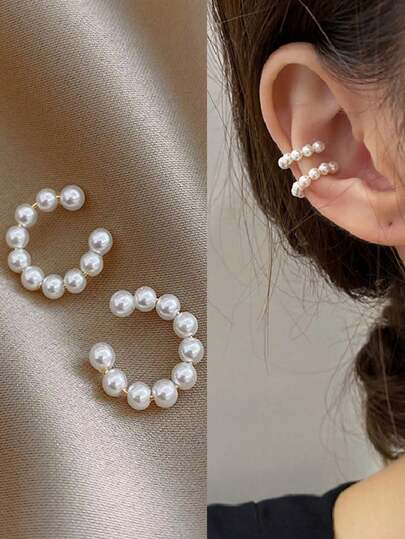 1 Paio Di Orecchini A molletta A Forma Di C In Perle Senza Foratura, Orecchini Minimalisti Per Donna, Gioielli Di Moda Adatti Come Regalo Di Compleanno Per L'uso Quotidiano - Bianco - Visualizzare 1
