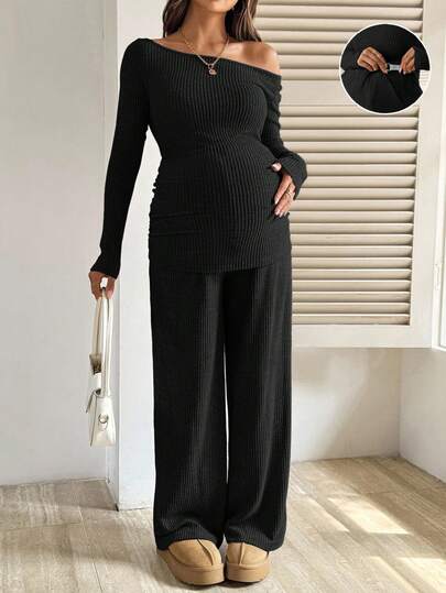 SHEIN 2 pezzi Set di top con spalla obliqua casual e pantaloni regolabili per gravidanza - nero - Visualizzare 1