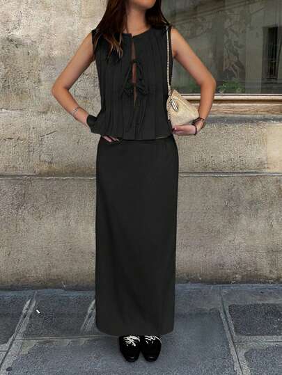 2 pezzi/Set Top corto plissettato con laccio davanti e gonna lunga a sirena in vita bassa per donna, include gonna, canotta abbinata, gonna in chiffon fluida, set da spiaggia sexy con spalline sottili, decorazione con fiocco, adatto per primavera, estate, autunno - nero - Visualizzare 2