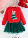 2 pezzi Set di top a maniche lunghe in chiffon con stampa a fiocco e pantaloni casual per bambine, alla moda e dolce