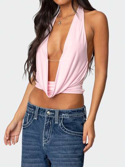 Top casual da donna con scollo a canottiera, con drappeggio frontale, schiena aperta e sexy - Rosa - Visualizzare 1