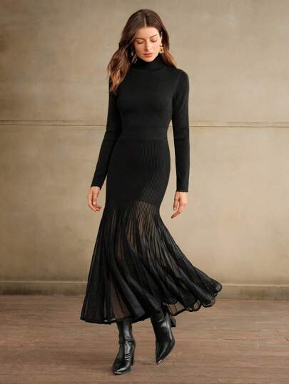 Anewsta Vestito lavorato a maglia da donna con collo alto, vita aderente, inserti in tessuto, paillettes trasparenti e orlo a coda di pesce, adatto per Natale - nero - Visualizzare 1