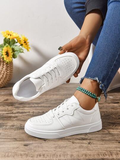 scarpi sportivi casual da donna tinta unita, traspiranti, con lacci e fori, di stile versatile e alla moda, adatte per uso sportivo quotidiano, per tutte le stagioni - Bianco - Visualizzare 1