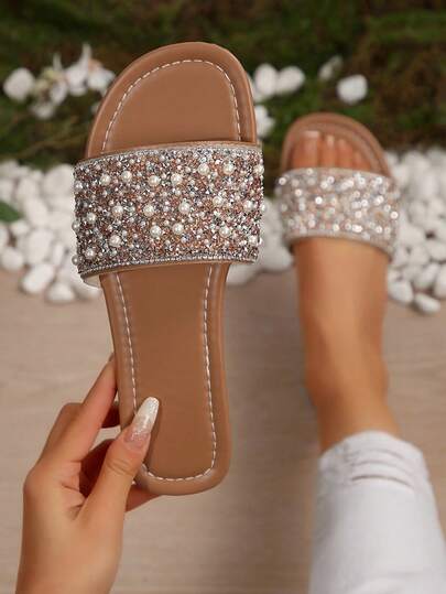 صندل شاطئ كاجوال مسطح للنساء، به حزام مرصع بحبيبات بلاستيكية مزيف وإكسسوارات ألماس، صندل كاجوال للبس في الخارج واستخدامات الشاطئ، بلون واحد - بني - مشاهدة 1