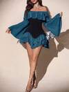 Feyla فستان قصير أنيق للنساء بياقة حلقية وأكمام جرس وكتف مكشوف بلون أحادي مع كشكشة