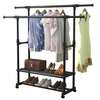 キャスター付きダブルロッド衣類ラック 伸縮式バー付き衣類ラック 高さ調節可能