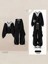 プラスサイズ レディース ブラック 2点セット シャツ&パンツ、エレガントカジュアルスタイル ボタン付き、オフィスや日常着に最適、秋冬向けのカーブフレンドリーなアウトフィット、感謝祭やクリスマスの集まりに最適、プラスサイズのエレガントなスーツ 春