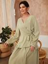 Modelyn ハイネック ロング ランタンスリーブ プリーツヘム ベルト付き モデスト ロングイブニングドレス