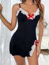 1 pièce Nuisette grande taille pour femmes avec bordure en dentelle, fentes latérales et bretelles décorées de nœuds, Noël