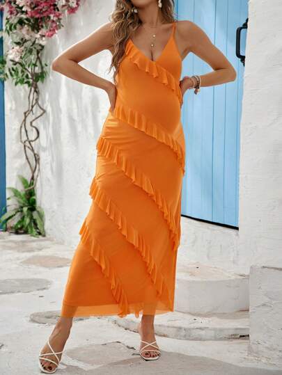 SHEIN Robe longue sans manches slim fit de maternité avec bordure à volants pour la ville ou la station balnéaire - Orange - Voir 1