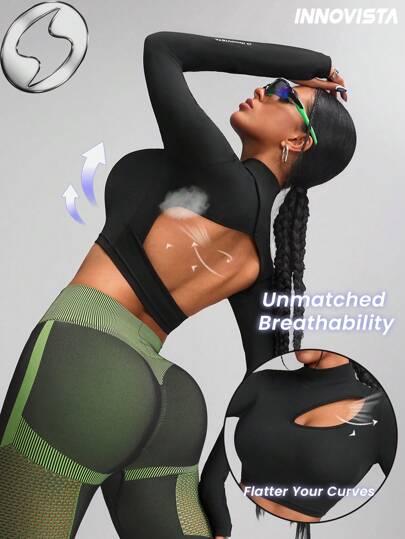 Innovista Top de sport sexy à manches longues asymétrique et dos nu pour femme. Top de gym respirant avec une haute élasticité et un séchage rapide. Tenue de sport, entraînement, fitness, course, musculation, yoga, tennis, cardio, festival de musique, fête, danse, automne, sweatshirts noirs, soutien-gorge de sport, Y2K, sous-couche - Noir - Voir 5