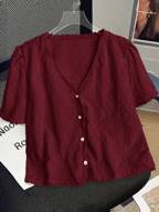 SHEIN LUNE Women's Casual Solid Color V-Neck Flare Sleeve Twist Front Blouse, Spring/Autumn Brown V-Neck Top Dark Brown Top Chocolate Brown Top Coffee Brown Top Brown Tie Front Top