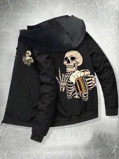 Men Long Sleeve Spring Autumn Casual Sports Zipper Hooded Rave Jacket With Skull Print Pattern - Black - View 1