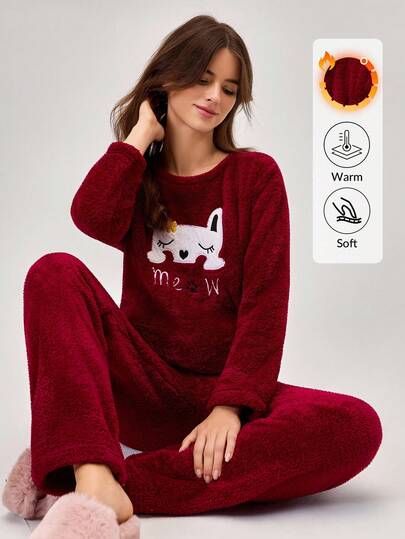 Loomlin Women Casual Fuzzy Wellsoft Fabric Warm Cute Animal Embroidery Long Sleeve Sleep Top+ Solid Sleep Pants Lounge Pajama Sets - Burgundy - View 1