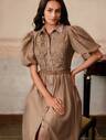 Anewsta Vestido maxi elegante con cuello en V, mangas abullonadas y cintura ceñida para mujer