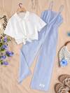 SHEIN Conjunto de 2 piezas para adolescentes: Camisa corta de tejido blanco puro casual y mono de pierna ancha con plisado rayado, adecuado para vacaciones casuales, festivales, almuerzos y viajes