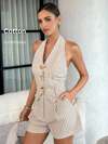 SHEIN x Eduarda Gutierrez Soleia Conjunto de 2 piezas para mujer con top corto de punto a rayas y shorts ajustados de tiro súper bajo, atuendo adecuado para vacaciones, fiestas, Navidad, San Valentín, citas, playa, crucero, carnaval, Pascua, Año Nuevo Chino