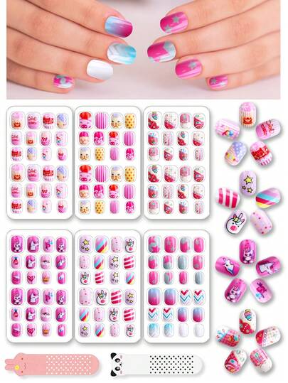 144pcs/Set Kids Press-On Nails Pre-Adhesive Full Coverage Nail Tip Set Glitter Gradient Rainbow Short Artificial Nails Set Cute Gift For Children And Girls - - Multicolor - View 6