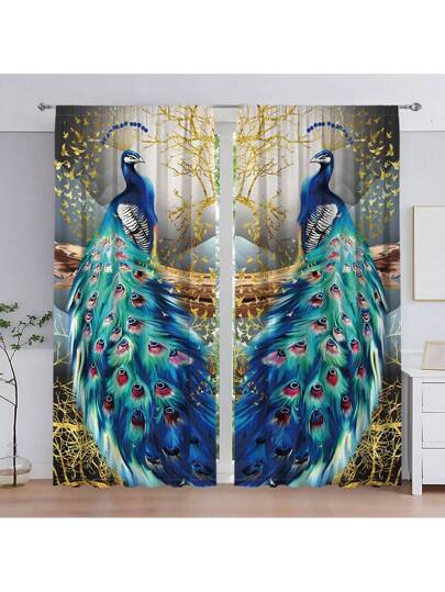 2pcs/set Digital Printed Curtains With Blue Peacock And Gold Tree Design, Made Of Polyester, Suitable For Living Room, Bedroom, Kitchen, Bathroom, Dining Room, Cafe, Home Decor - Blue - View 1