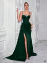ADYCE Sequin Thick Strap Heart Neck High Waist Long Satin Slit Open Back Tie Maxi Party Dress, Suitable For Ball, Birthday Party, Formal Dinner, Date, Homecoming, Wedding Guest, Formal Gala, Family Gathering, Holiday, New Year And Other Occasions
