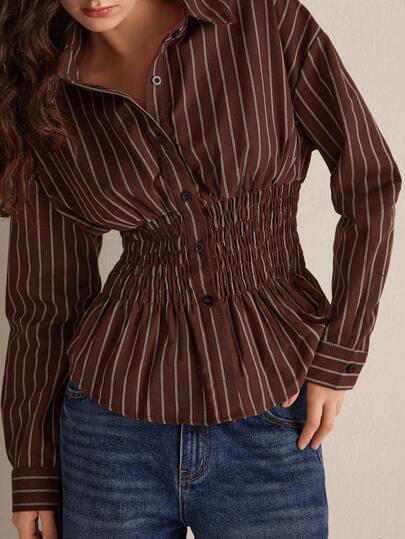Easelle Brown Striped Woven Women's Long-Sleeved, Drop-Shoulder Button-Down Shirt With A Cinched Waist. Autumn/Winter 2025. - Brown - View 1