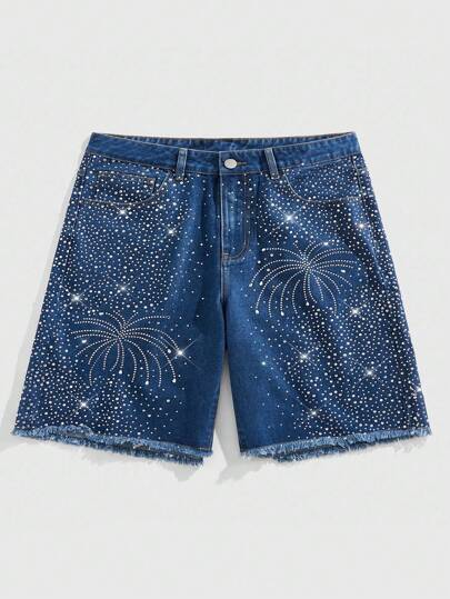 ROMWE MEN Street Life Men's Summer Fashion Rhinestone Frayed Slant Pocket Denim Shorts - Blue - View 1