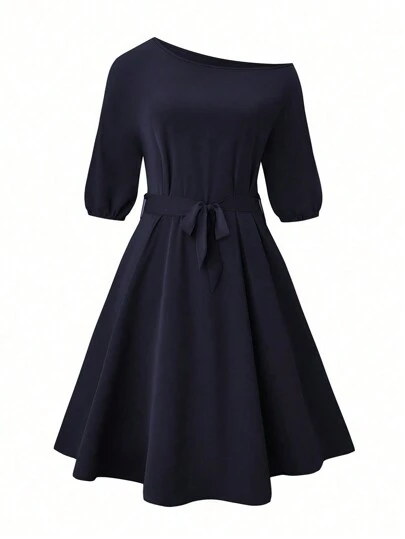 SHEIN Clasi Plus Size Asymmetrical Neckline Dress With Hidden Pockets - Navy Blue - View 1