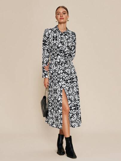 Chiquease Women's Autumn Floral Print Long Sleeve Split Hem Elegant Shirt Dress - Black and White - View 1