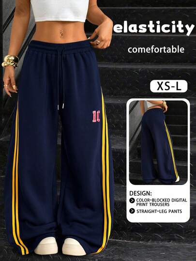 Women's Casual Numeric Print Pants With Side Stripe And Drawstring - Royal Blue - View 1