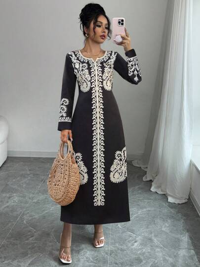 Breezaya Women's Long Waist Defined Print Maxi Dress, Elegant Casual Resort Wear - Black - View 1