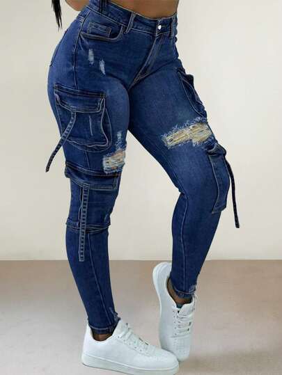 Y2K Flap Pocket Cargo Jeans - Vintage Denim Streetwear For Autumn - Blue - View 4