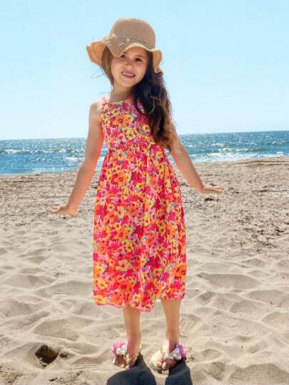 SHEIN Young Girl Casual Sweet & Cute Floral Pattern Back Tie Bow Decor Mini Dress - Orange - View 1