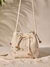 Tropiscape Mini Floral Embroidered Drawstring Detail Vacation, Straw Purse, White Straw Beach Bag, Beach Necessities, Beach Essentials,Beach Stuff & Summer Essentials Beach Autumn Winter Gifts