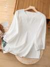 GlowEve Women's White V-Neck Embroidered Short Sleeve Shirt