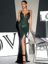 Zielona sukienka koktajlowa z długim rękawem i okrągłym dekoltem, odkrytą plecami i cekinami